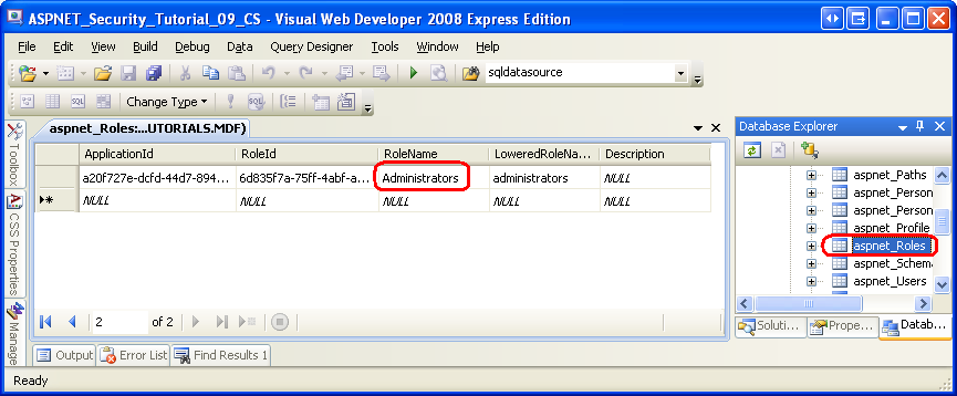 What happens? A postback occurs, but there’s no visual cue that the role has actually been added to the system. We will update this page in Step 5 to include visual feedback. For now, however, you can verify that the role was created by going to the SecurityTutorials.mdf database and displaying the data from the aspnet_Roles table. As Figure 4 shows, the aspnet_Roles table contains a record for the just-added Administrators roles.