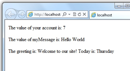 You can store values in a variable, including strings, numbers, and dates, etc. You create a new variable using the Dim keyword. You can insert variable values directly in a page using @.