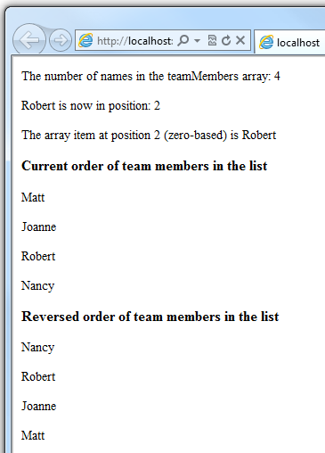 You can determine the number of items in an array by getting its Length property. To get the position of a specific item in the array (that is, to search the array), use the Array.IndexOf method. You can also do things like reverse the contents of an array (the Array.Reverse method) or sort the contents (the Array.Sort method).