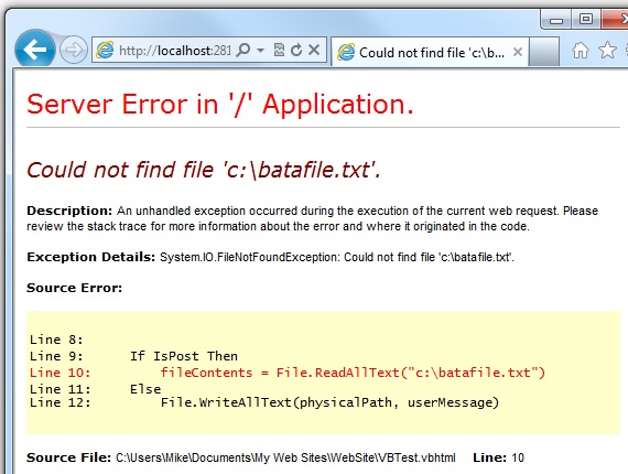 If your code didn’t handle the exception, you would see an error page like the previous screen shot. However, the Try/Catch section helps prevent the user from seeing these types of errors.