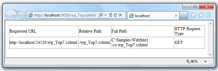 You’ll often work with the Request object, which gives you information like the values of form fields on the page (text boxes, etc.), what type of browser made the request, the URL of the page, the user identity, etc. This example shows how to access properties of the Request object and how to call the MapPath method of the Request object, which gives you the absolute path of the page on the server: