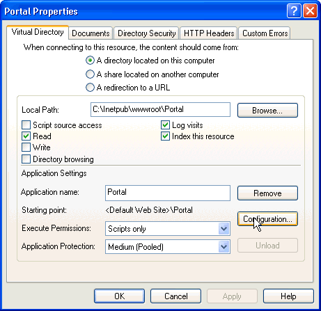 Run Aspnet_regiis.exe -sn W3SVC/1/ROOT/Portal to update the portal IIS script map, without affecting applications in the portal?s subdirectories.