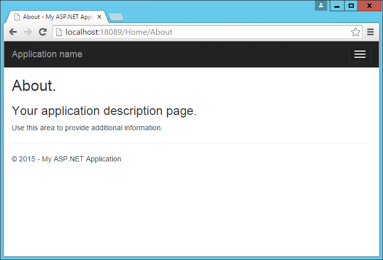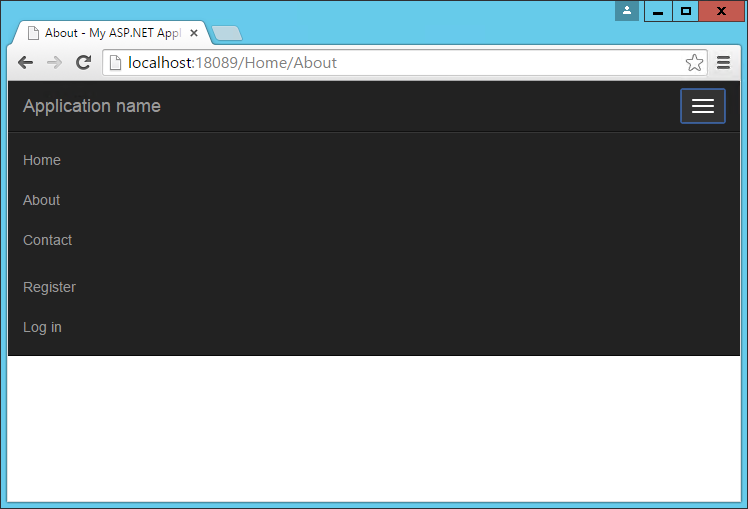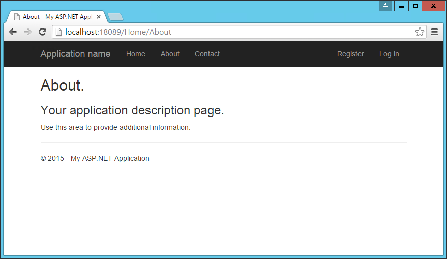 </button>It also includes the application name, which appears in the top left. The main navigation menu is rendered by the <ul> element within the second div, and includes links to Home, About, and Contact. Additional links for Register and Login are added by the _LoginPartial line on line 29. Below the navigation, the main body of each page is rendered in another <div>, marked with the “container” and “body-content” classes. In the simple default _Layout file shown here, the contents of the page are rendered by the specific View associated with the page, and then a simple <footer> is added to the end of the <div> element. You can see how the built-in About page appears using this template: