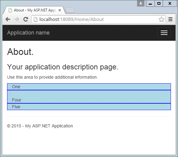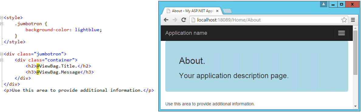 If you’ve used the default ASP.NET MVC templates in Visual Studio 2012 or 2013, you’ve probably seen the Jumbotron in action. It refers to a large full-width section of a page that can be used to display a large background image, a call to action, a rotator, or similar elements. To add a jumbotron to a page, simply add a <div> and give it a class of “jumbotron”, then place a container <div> inside and add your content. We can easily adjust the standard About page to use a jumbotron for the main headings it displays: