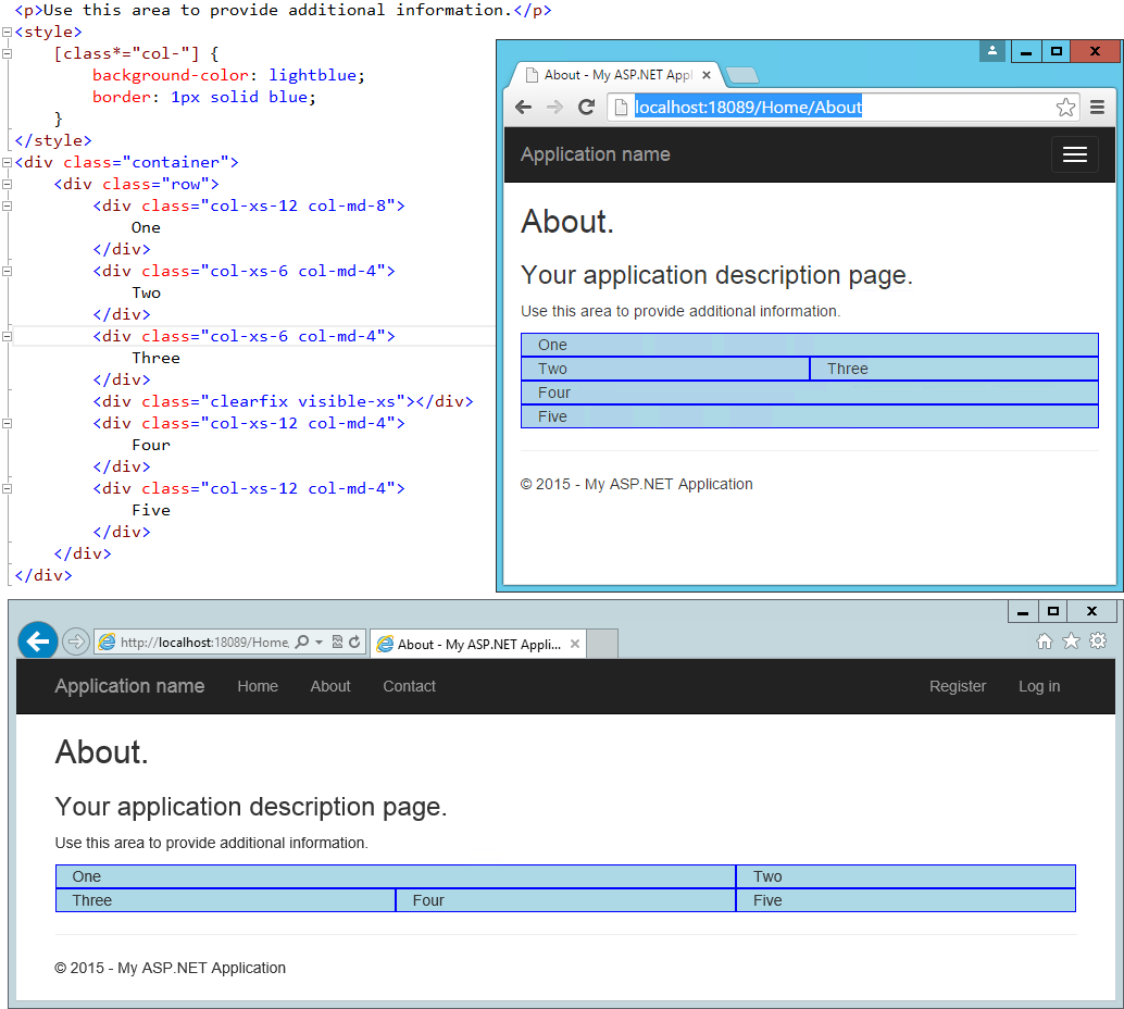 In the above example, One and Two share a row in the “md” layout, while Two and Three share a row in the “xs” layout. Without the clearfix <div>, Two and Three are not shown correctly in the “xs” view (note that only One, Four, and Five are shown):