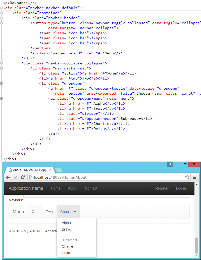 The default template uses a set of <div> elements to render a top navbar and the main body of the page. If you’re using HTML5, you can replace the first <div> tag with a <nav> tag to get the same effect, but with more precise semantics. Within this first <div> you can see there are several others. First, a <div> with a class of “container”, and then within that, two more <div> elements: “navbar-header” and “navbar-collapse”. The navbar-header div includes a button that will appear when the screen is below a certain minimum width, showing 3 horizontal lines (a so-called “hamburger icon”). The icon is rendered using pure HTML and CSS; no image is required. This is the code that displays the icon, with each of the tags rendering one of the white bars: