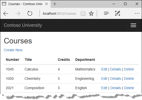 item.OfficeAssignment.Locationonly ifitem.OfficeAssignmentis not null. (Because this is a one-to-zero-or-one relationship, there might not be a related OfficeAssignment entity.)Added a Courses column that displays courses taught by each instructor. See (xref:)Explicit Line Transition with
