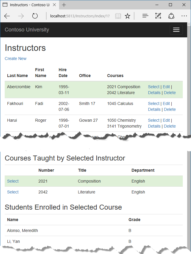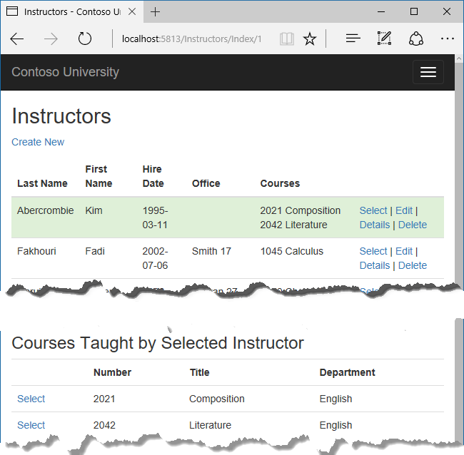 Refresh the page and select an instructor. Now you see a grid that displays courses assigned to the selected instructor, and for each course you see the name of the assigned department.