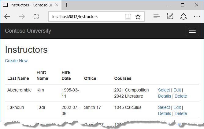 Run the app and select the Instructors tab. The page displays the Location property of related OfficeAssignment entities and an empty table cell when there’s no related OfficeAssignment entity.
