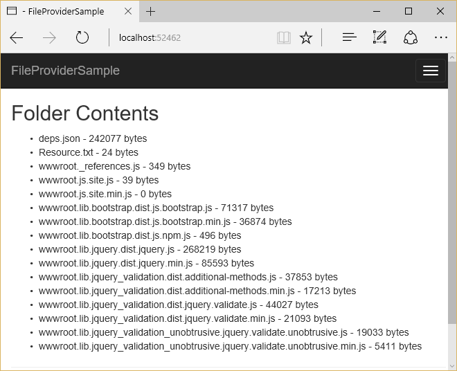 Updating the sample app to use a CompositeFileProvider that includes both the physical and embedded providers configured previously, results in the following output: