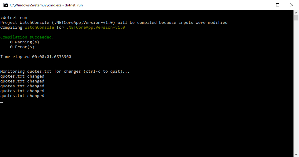 17: Console.WriteLine("Monitoring quotes.txt for changes (Ctrl-c to quit)...");