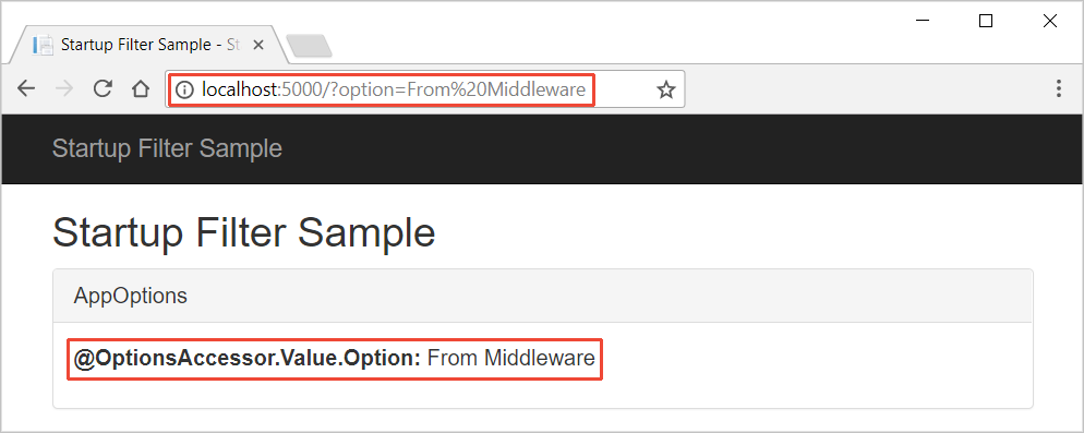 The sample app ((xref:)how to download) demonstrates how to register a middleware with IStartupFilter. The sample app includes a middleware that sets an options value from a query string parameter: