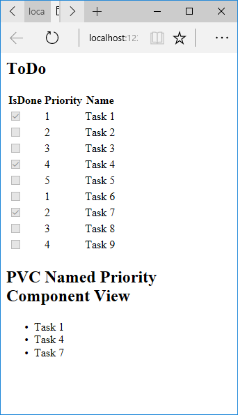 Copy the Views/Shared/Components/PriorityList/Default.cshtml file to a view named Views/Shared/Components/PriorityList/PVC.cshtml. Add a heading to indicate the PVC view is being used.