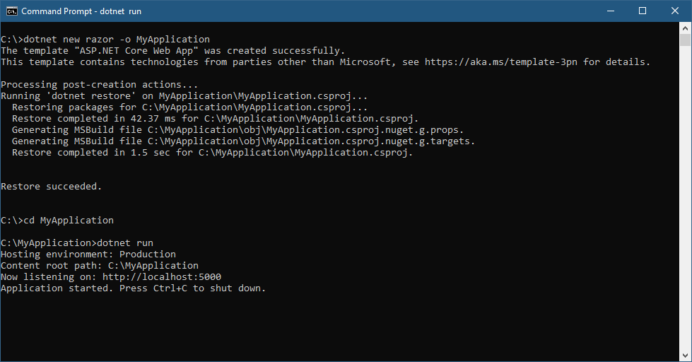 Create a new directory for the web application, create a new ASP.NET Core MVC application, and then run the website locally.