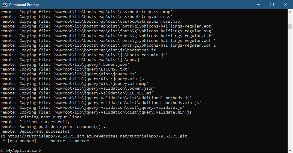 git push azure masterGit will prompt for the deployment credentials that were set earlier. After authenticating, the application will be pushed to the remote location, built, and deployed.