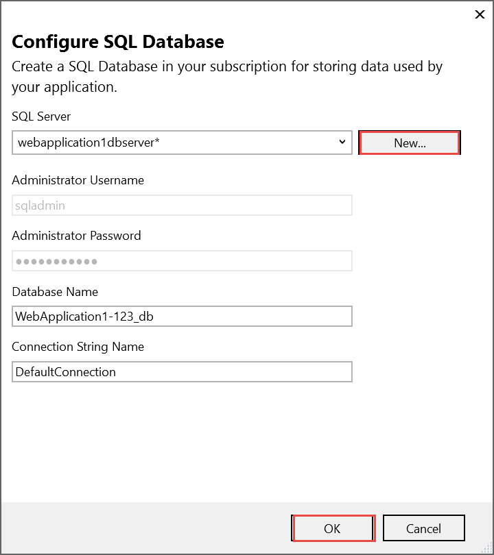 - Select New… on the Configure SQL Database dialog to create a new database.