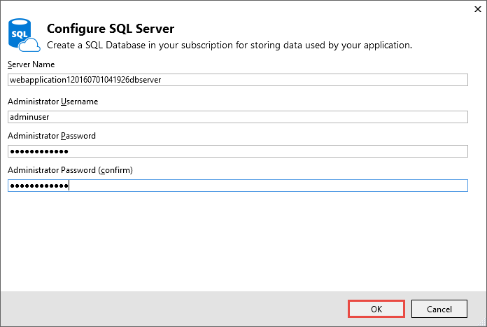 Enter an administrator user name and password, and then select OK. Don’t forget the user name and password you create in this step. You can keep the default Server Name.