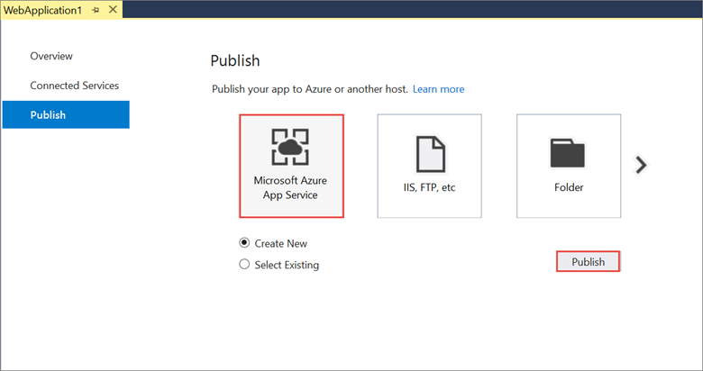 In the Publish dialog, select Microsoft Azure App Service and click Publish.