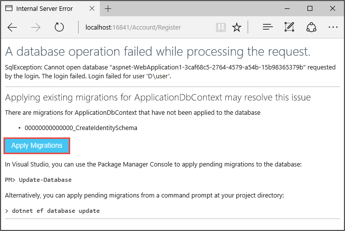 “Internal Server Error: A database operation failed while processing the request. SQL exception: Cannot open the database. Applying existing migrations for Application DB context may resolve this issue.”