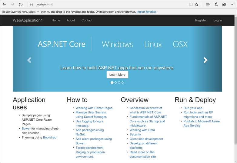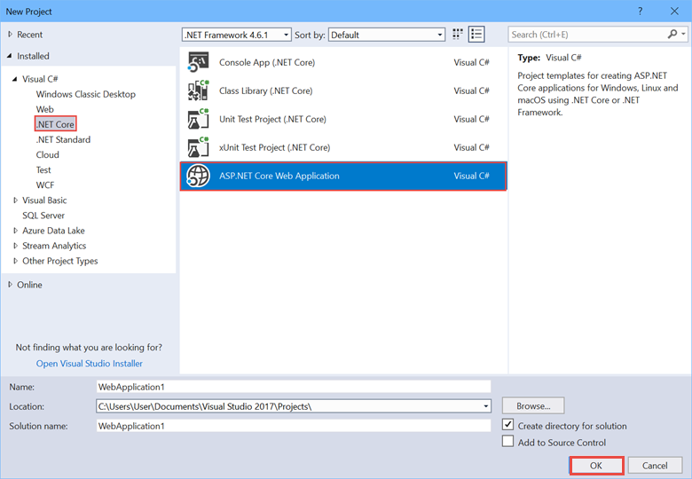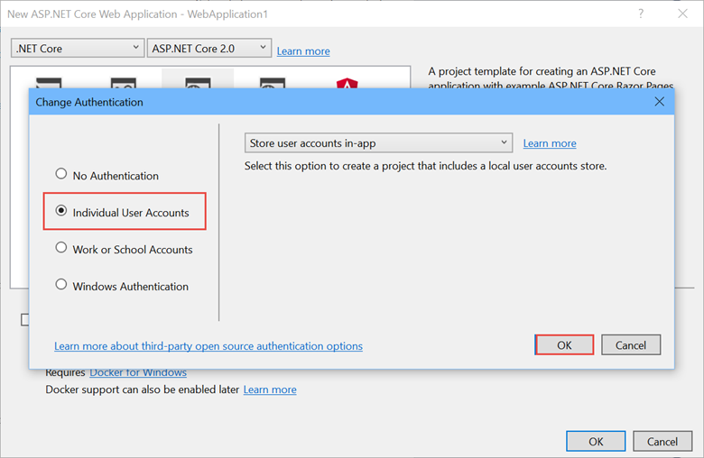 Select OK to return to the New ASP.NET Core Web Application, then select OK again.