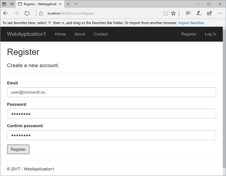 Select Register and register a new user. You can use a fictitious email address. When you submit, the page displays the following error: