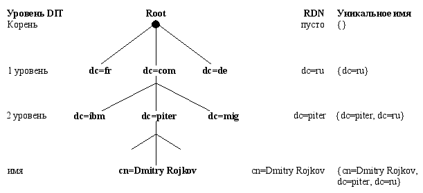 Каждая запись дерева содержит атрибут, который по совместительству является относительным уникальным именем записи – RDN (Relative Distinguished Name)4. Таким атрибутом, как правило, является имя объекта или его уникальный идентификатор. Уникальность этого имени "относительна" в масштабе всего Справочника, поскольку на разных ветвях DIT могут оказаться записи с одинаковыми RDN, подобно тому, как в разных подкаталогах одной файловой системы могут оказаться файлы с одинаковыми именами. И так же, как путь к файлу определяет его полное уникальное имя в пределах файловой системы, последовательность RDN-записей на пути от корня до нужной записи образует уникальное имя (DN) этой записи (рис. 2).