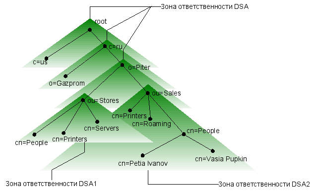 Модель каталогов (directory model) описывает, каким образом Справочник хранит информацию и как пользователи получают доступ к информации Справочника. Модель состоит из двух компонентов: пользовательского агента Справочника – DUA (Directory User Agent), запрашивающего Справочник от имени пользователя, и системного агента Справочника – DSA (Directory System Agent), который обеспечивает хранение некоторой части DIB и в то же время может являться точкой доступа к Справочнику для DUA. Каждому DSA делегируется своя область ответственности за хранение той или иной ветви DIT. Например, DSA1 может хранить записи, находящиеся ниже узла ou=Sales, o=Piter, c=ru, а DSA2 – отвечать за листья на ветке ou=Stores, o=Piter, c=ru. И администрировать их будут разные люди. При этом обязательно будет существовать DSA, обслуживающий корень дерева. Все это очень похоже на то, как работают серверы DNS.