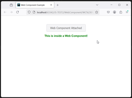 <!DOCTYPE html> <html lang="en"> <head> <meta charset="UTF-8"> <meta name="viewport" content="width=device-width, initial-scale=1.0"> <title>Web Component Example</title> <style> /* Global style */ body { font-family: Arial, sans-serif; text-align: center; margin-top: 50px; } button { padding: 10px 20px; font-size: 16px; cursor: pointer; } </style> </head> <body> <!-- Button to attach the Web Component --> <button id="attach-button">Attach Web Component</button> <!-- Root element where the Web Component will be attached --> <div id="root"></div> <script> // Define the Web Component class MyComponent extends HTMLElement { constructor() { super(); // Attach a shadow root const shadowRoot = this.attachShadow({ mode: 'open' }); shadowRoot.innerHTML = ` <style> /* Scoped style */ p { color: green; font-weight: bold; } </style> <p>This is inside a Web Component!</p> `; } } // Register the custom element customElements.define('my-component', MyComponent); // Add interaction: Attach the Web Component when the button is clicked const attachButton = document.getElementById('attach-button'); const root = document.getElementById('root'); attachButton.addEventListener('click', () => { // Create an instance of the Web Component const myComponent = document.createElement('my-component'); // Append the Web Component to the root element root.appendChild(myComponent); // Disable the button after attaching the Web Component attachButton.disabled = true; attachButton.textContent = 'Web Component Attached'; }); </script> </body> </html>