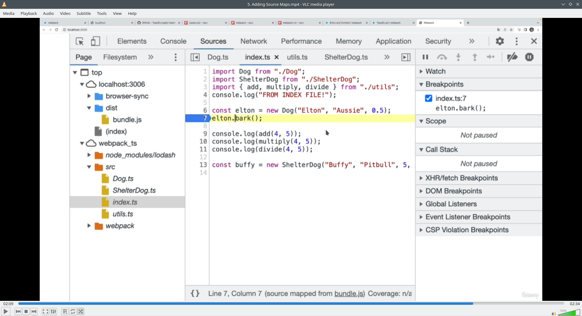For receive access to source *.TS file we need to produce SourceMap by Typescript compiler and include it to Webpack config..