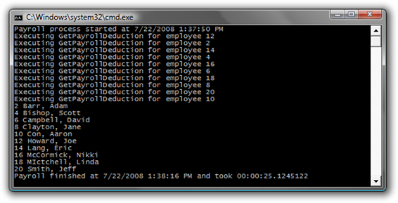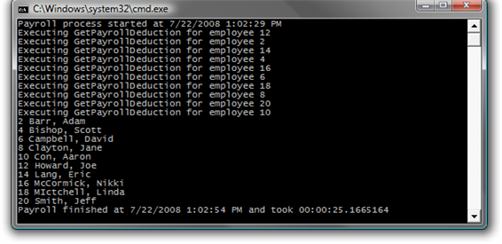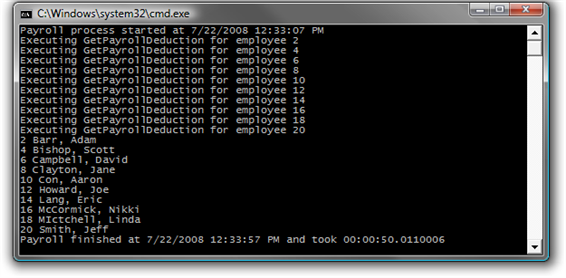- You should observe that the LINQ query performs the operations in order of the Employee ID. Also observe the total amount of time required to complete the work (the exact time required will vary):