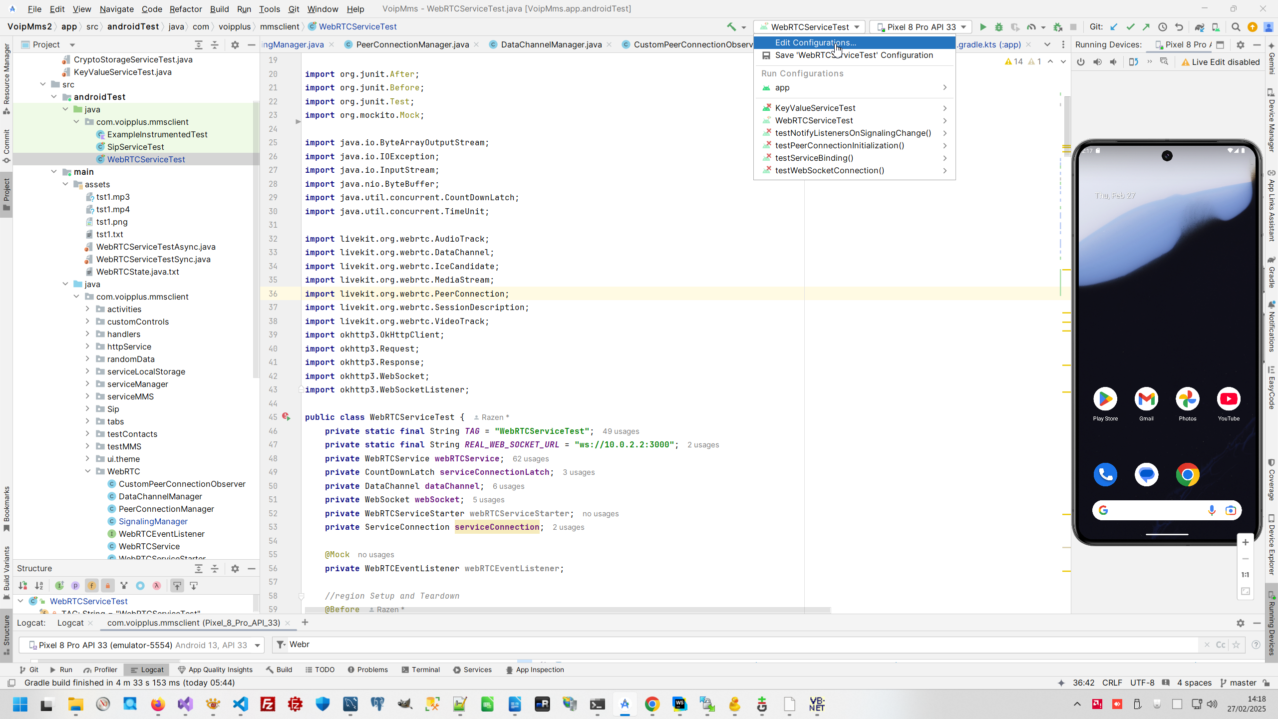 Isolate Android WebRTC service with MoSKito and testing it with endpoint based on Node.JS WebRTC endpoint.