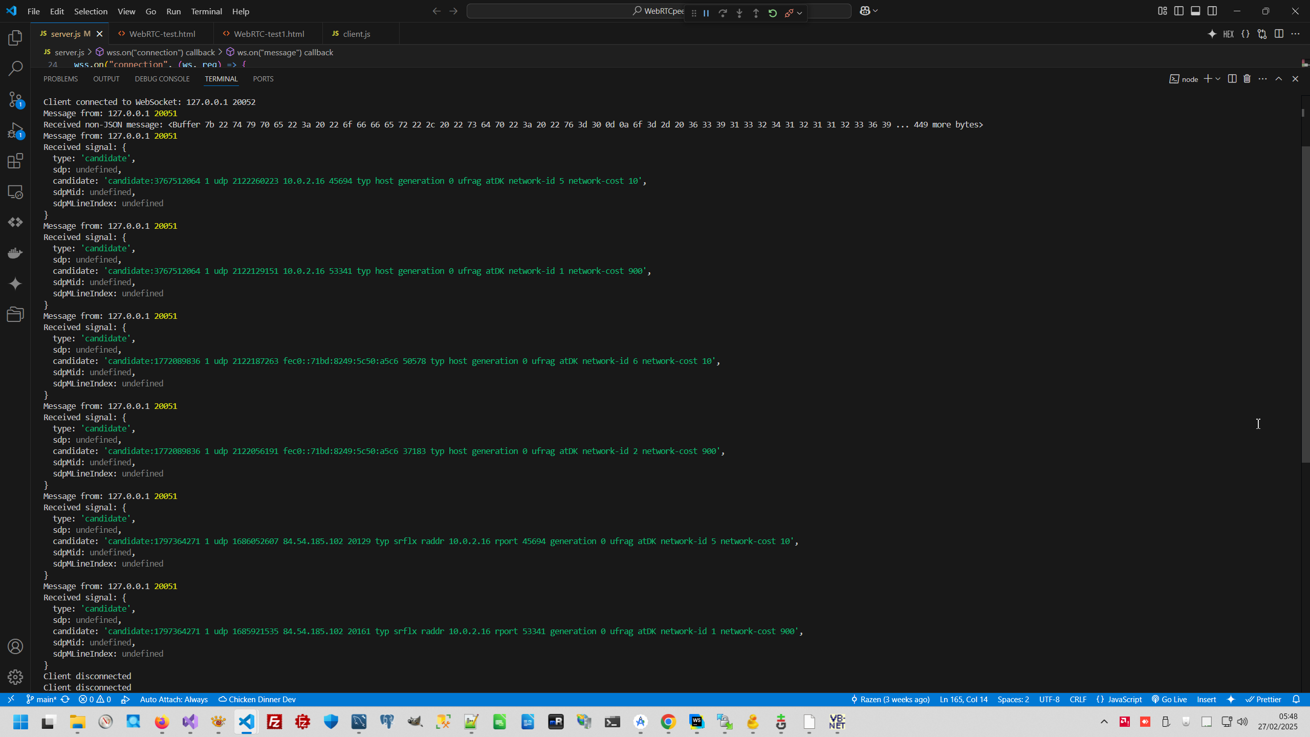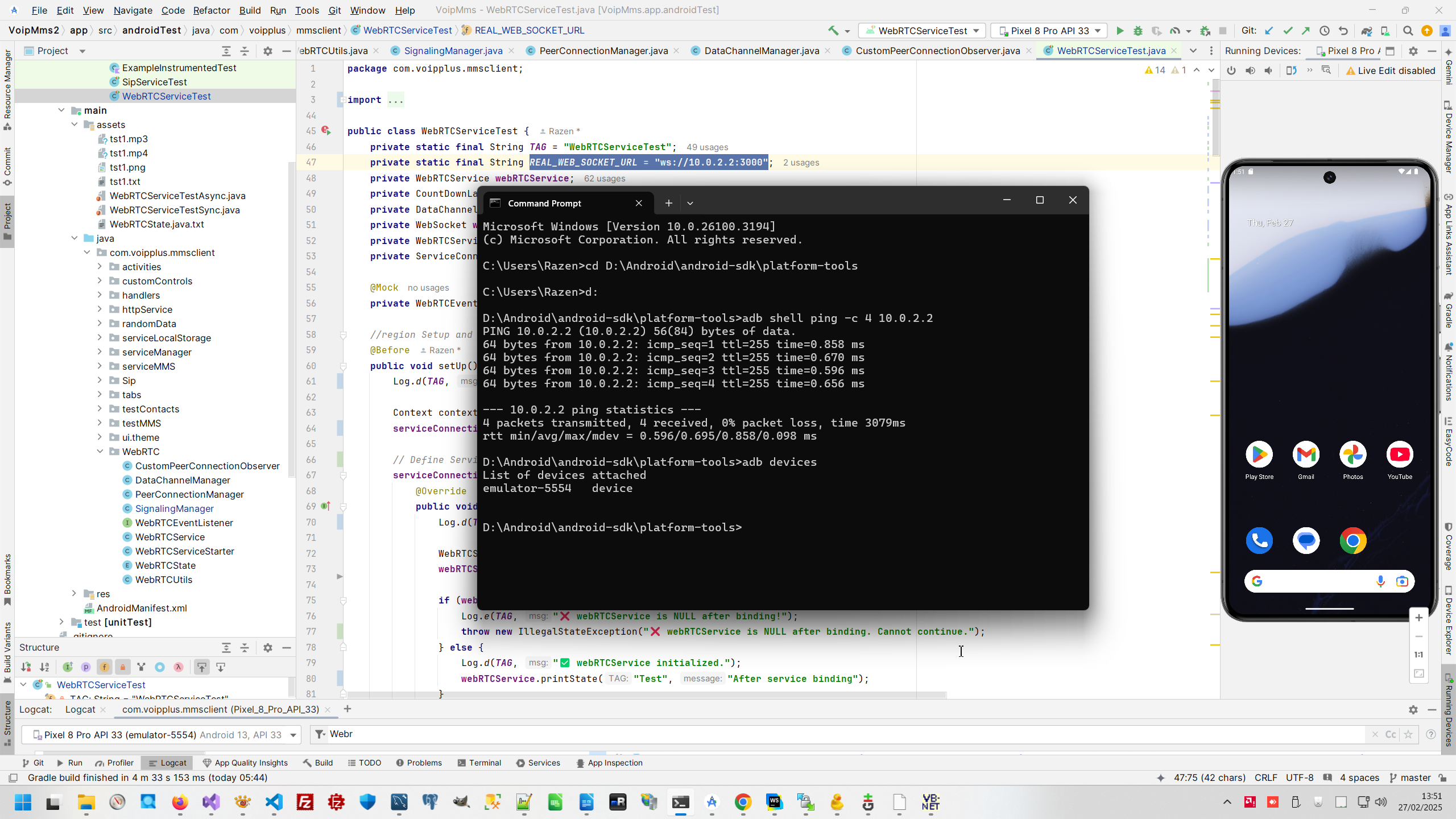 So, firstly, I have WebRTC test peer, what I used for debugging many of my WebRTC application, I mention this test peer in ths post My new project with WebRTC, what is WebRTC?, however for this test that test peer was changed (for example to enforce fixed datachannel name "testDataChannel" and many other changing). This test peer started on the local developer's computer and accessible from Android as REAL_WEB_SOCKET_URL = "ws://10.0.2.2:3000".